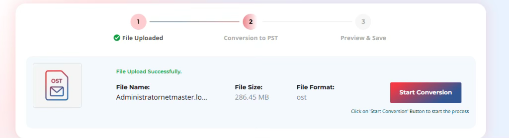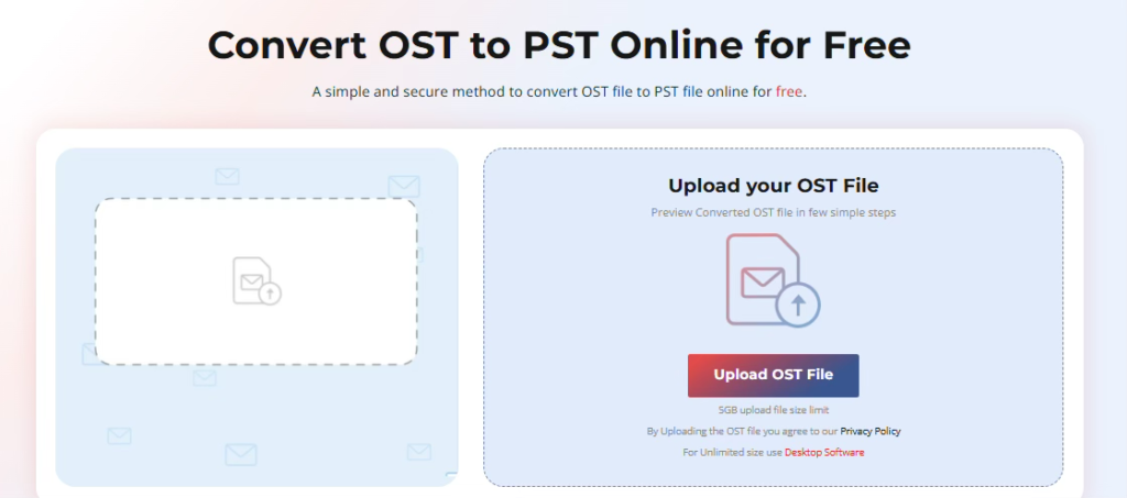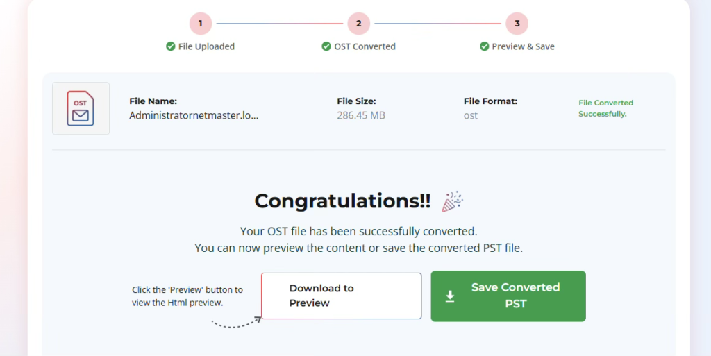Users can upload their OST file, process it, and download the converted PST file within minutes.