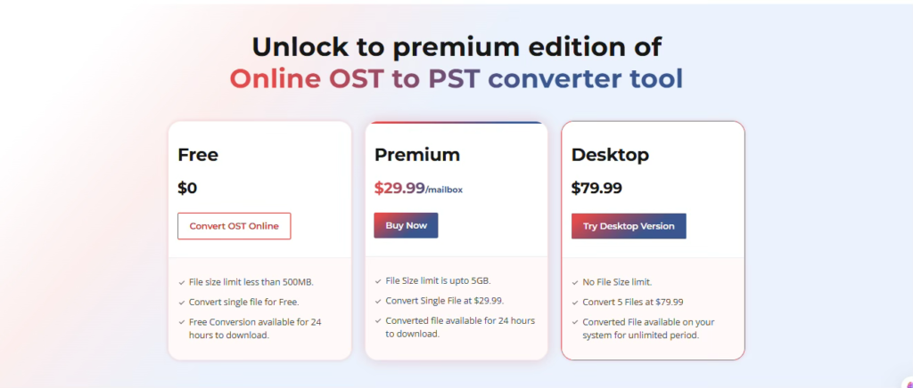 • Free ($0): Suitable for basic use convert one OST file up to 500 MB with a 24-hour download window.